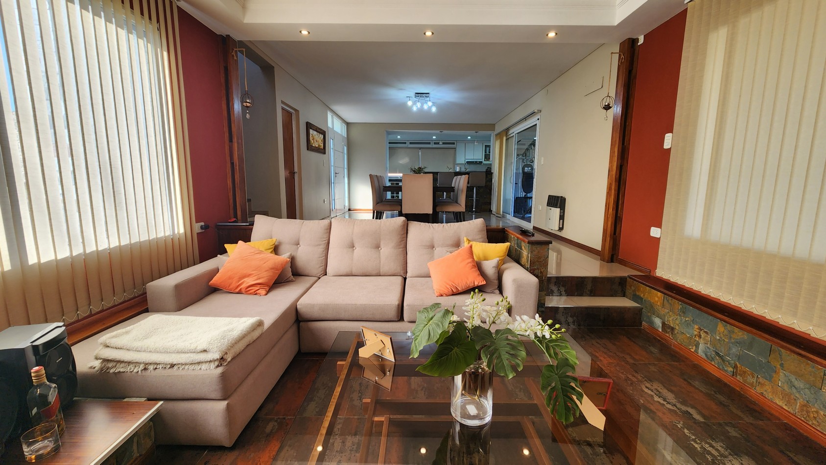En la planta baja, al ingresar, nos recibe un amplio living-comedor con desnivel, lo que permite diferenciar los espacios de forma moderna y armónica.