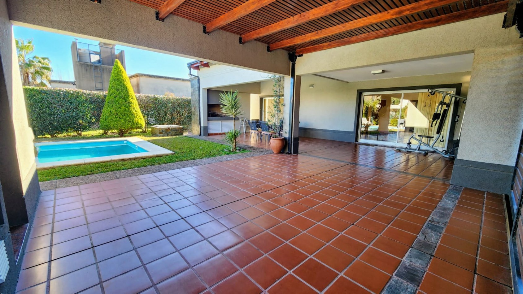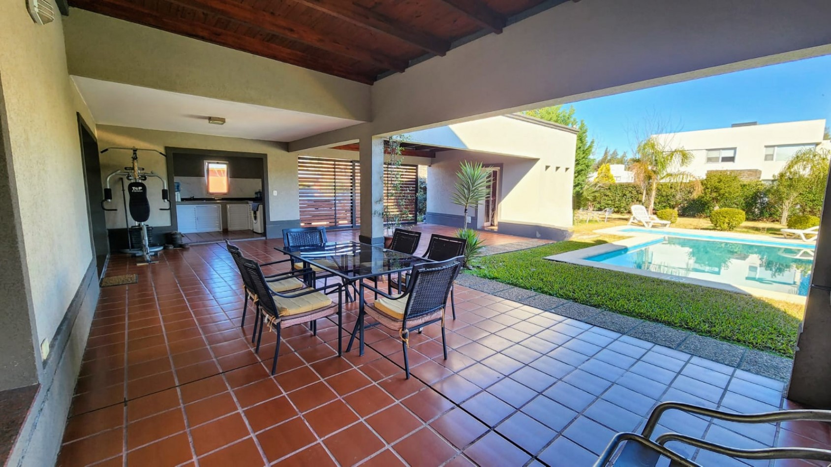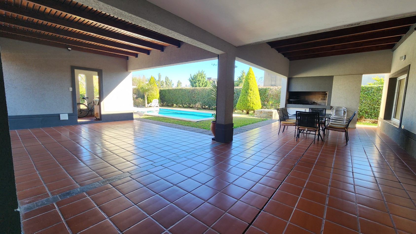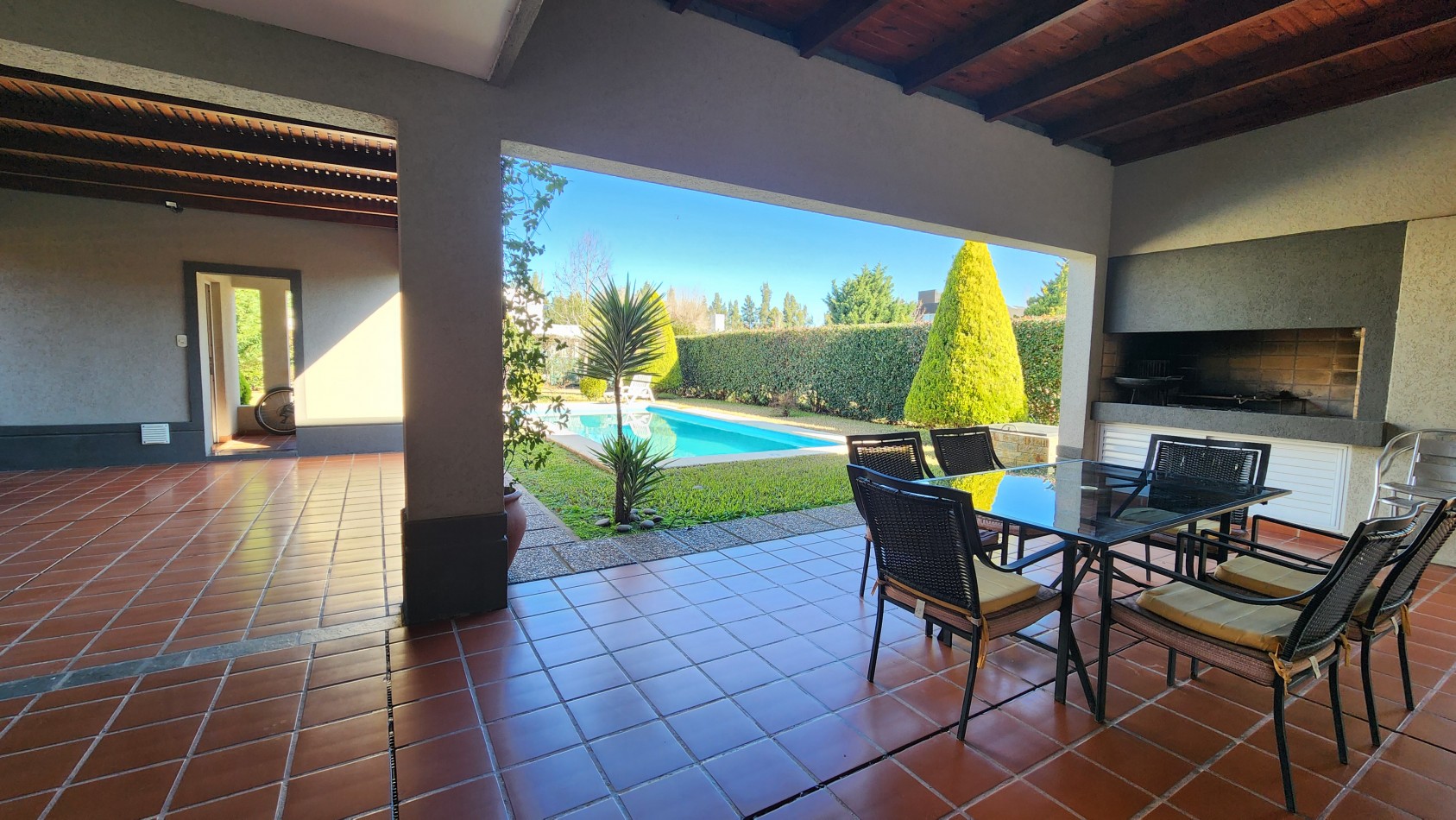 La propiedad cuenta con una galería cubierta con parrillero, orientada al jardín, desde donde se aprecian vistas abiertas hacia una piscina de generosas dimensiones y un parque arbolado, muy cuidado y luminoso.