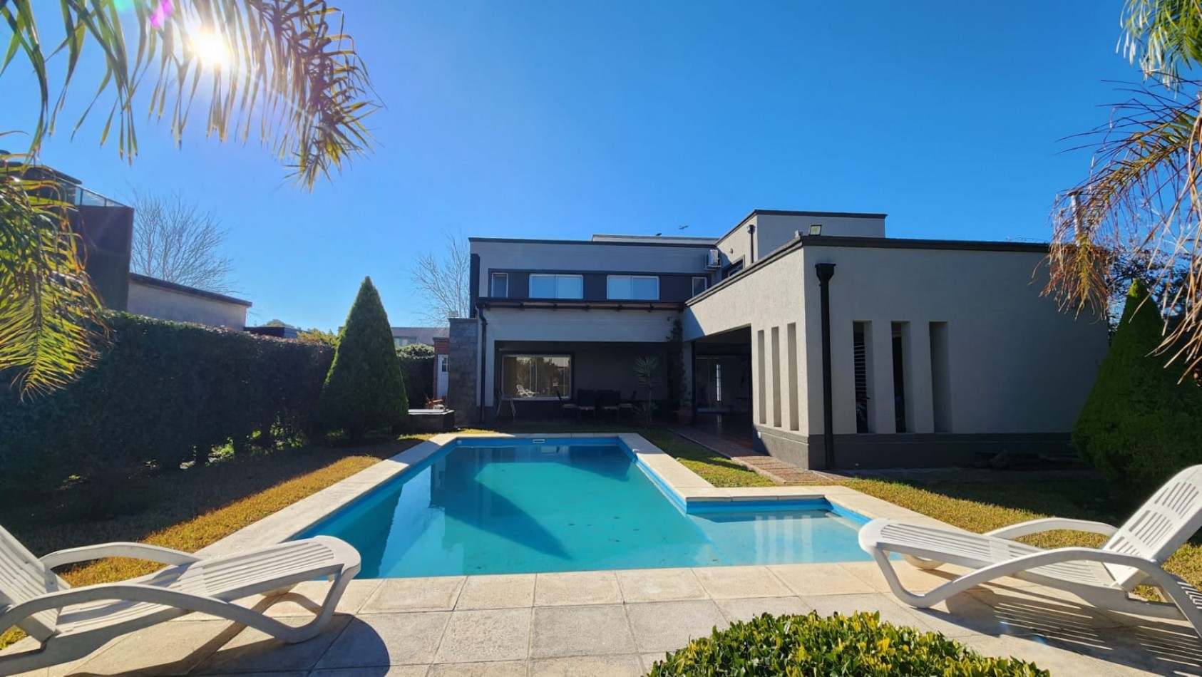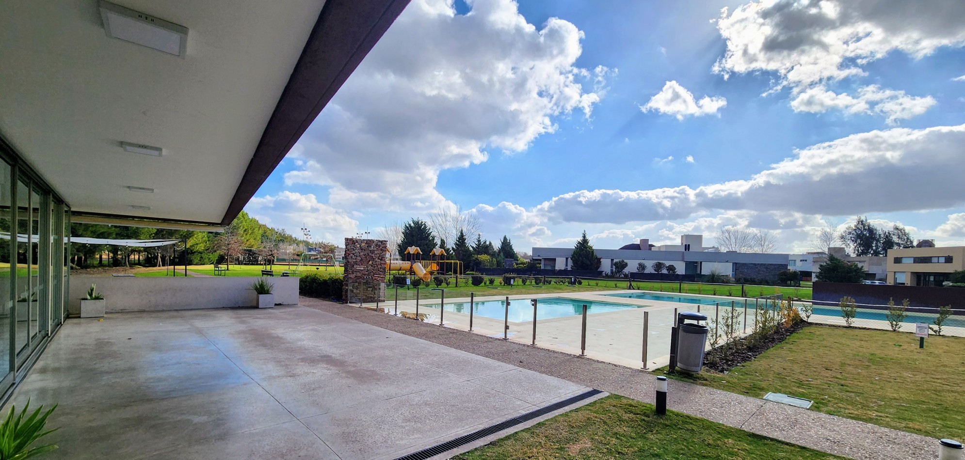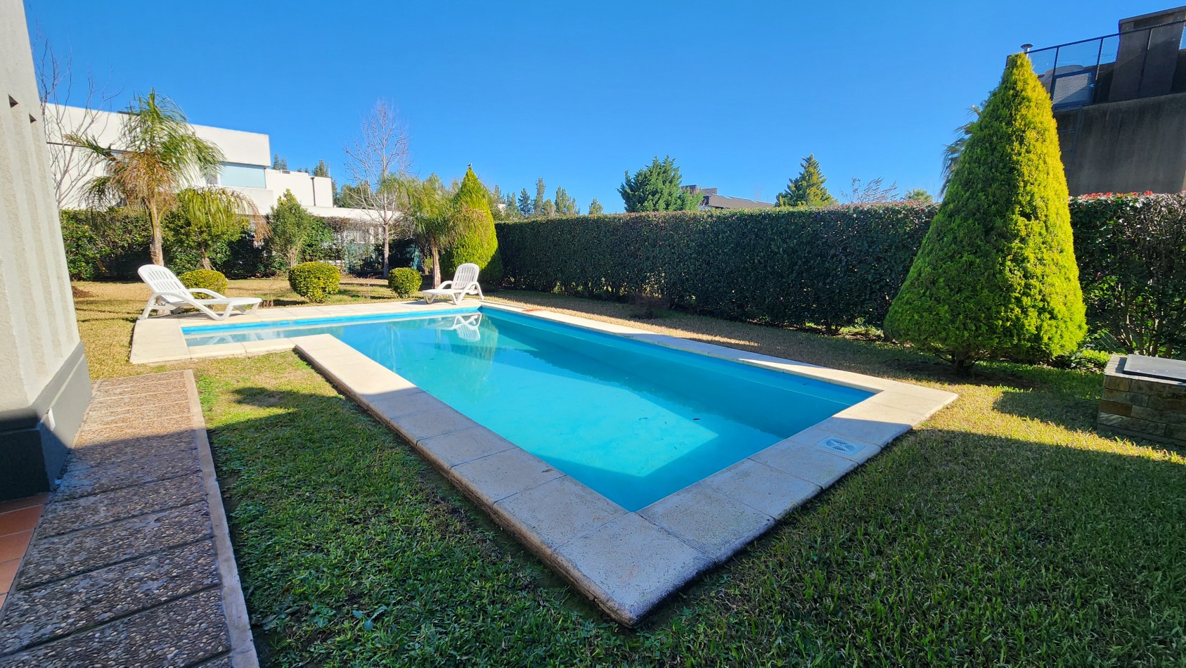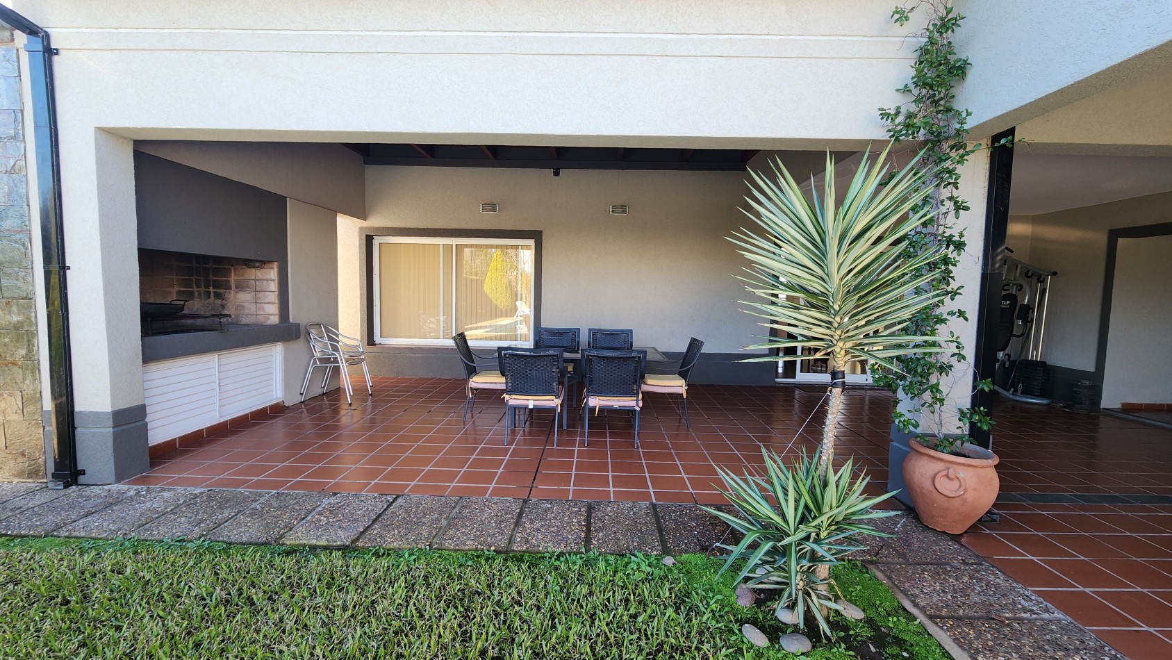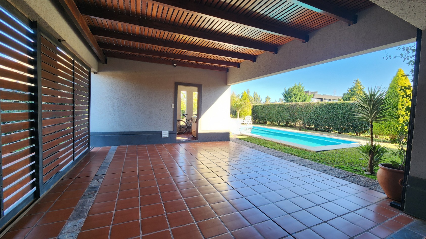 La propiedad cuenta con una galería cubierta con parrillero, orientada al jardín, desde donde se aprecian vistas abiertas hacia una piscina de generosas dimensiones y un parque arbolado, muy cuidado y luminoso.