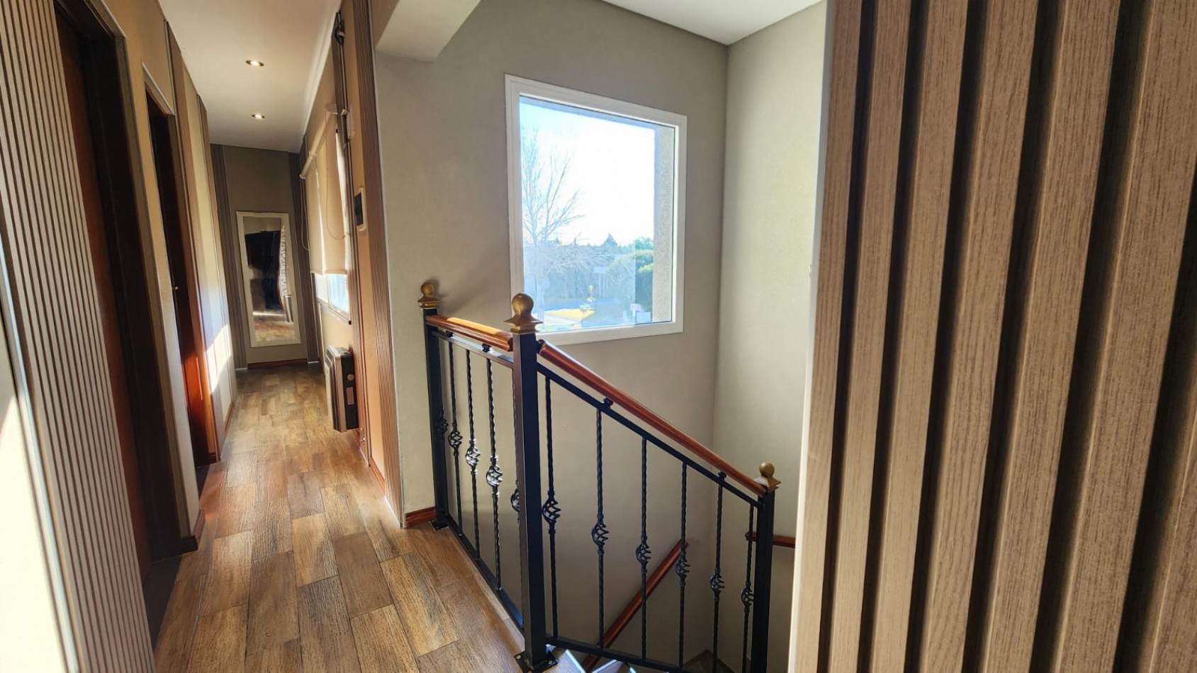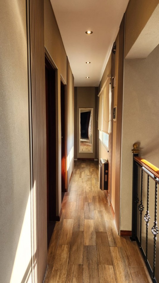 En la planta alta se desarrolla la zona íntima, compuesta por tres dormitorios. El principal es en suite y cuenta con vestidor, baño completo , sala de estar recreativa previa al dormitorio y amplios ventanales que aportan gran luminosidad. Los otros dos dormitorios son espaciosos, con placares empotrados y vistas al Jardín, comparten un baño completo con antebaño.