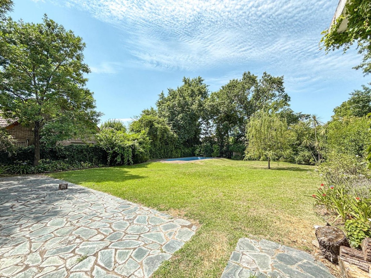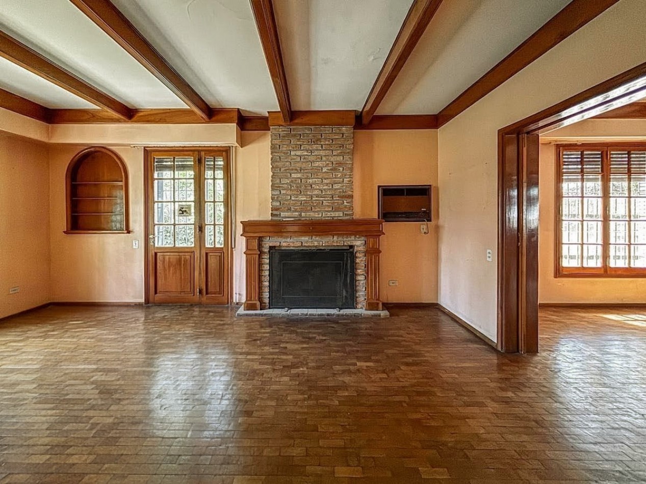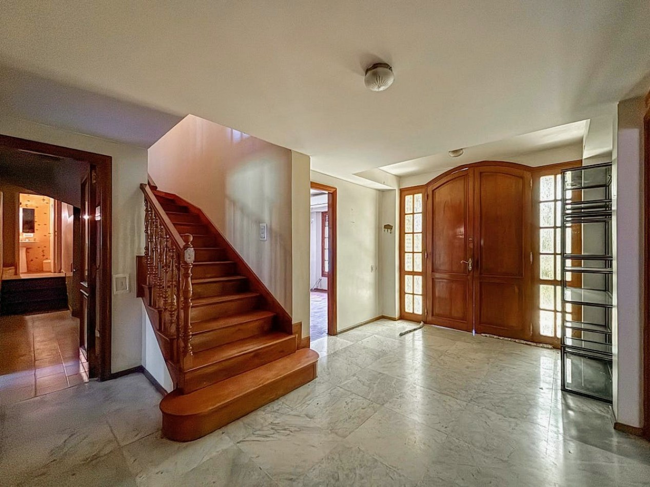 En planta baja, un importante hall de recepción da paso a un living y comedor independientes, ambos con detalles nobles y materiales de categoría. Se suma un comedor diario, cocina independiente, escritorio, family room o jardín de invierno con vistas abiertas al parque, baño de servicio y lavadero independiente. El sector exterior ofrece un gran jardín parquizado con piscina equipada, quincho con parrillero y cochera para tres vehículos con portón automatizado.