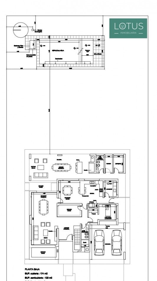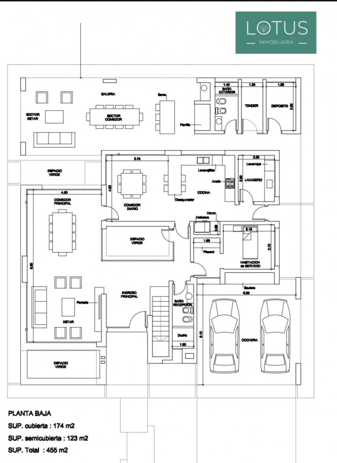 La propiedad se encuentra en un lote de 1.200 m2 de terreno y tiene una superficie total de 455 m2, distribuidos en dos plantas. La superficie cubierta es de 334 m2 y la superficie semicubierta es de 123 m2.