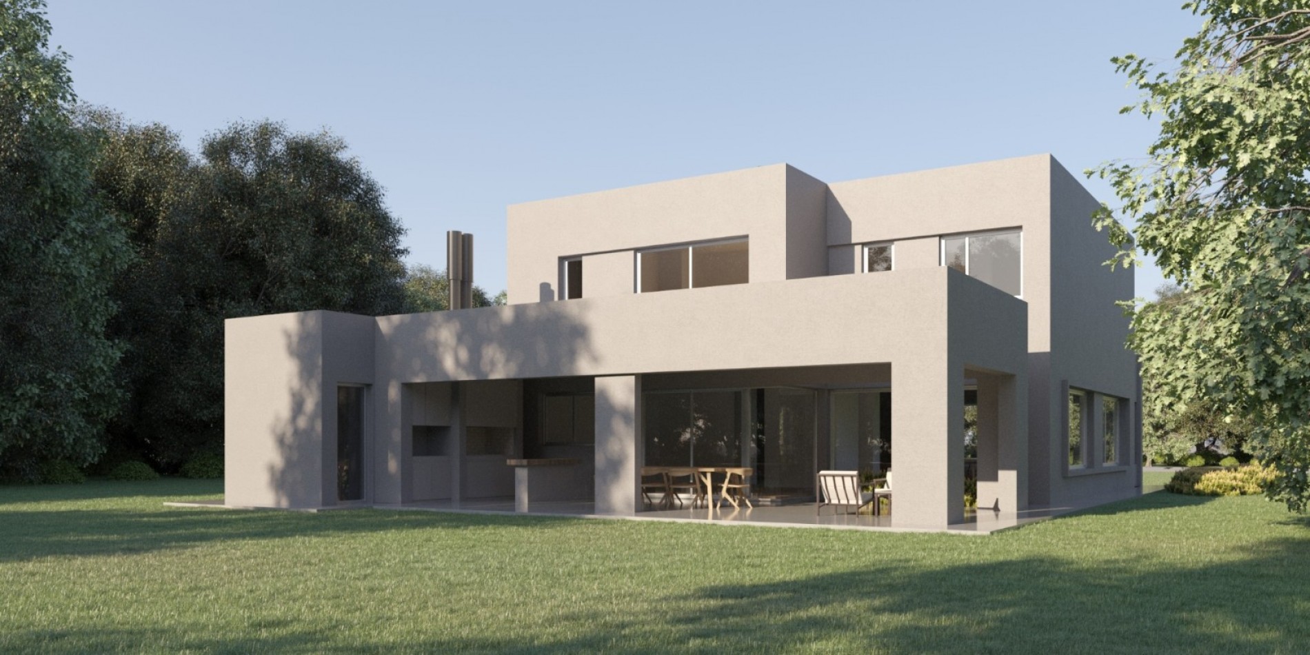 Desarrollada sobre un lote de 800 m², la casa cuenta con una superficie total construida de 358 m², con amplios espacios interiores y áreas semicubiertas que se integran de manera armónica con el jardín y la piscina.