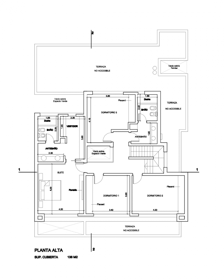 En planta alta se desarrollan cuatro dormitorios: una suite principal con vestidor, antebaño y baño, y tres dormitorios adicionales asistidos por un baño completo con antebaño. La planta cuenta además con terraza con vistas al jardín.