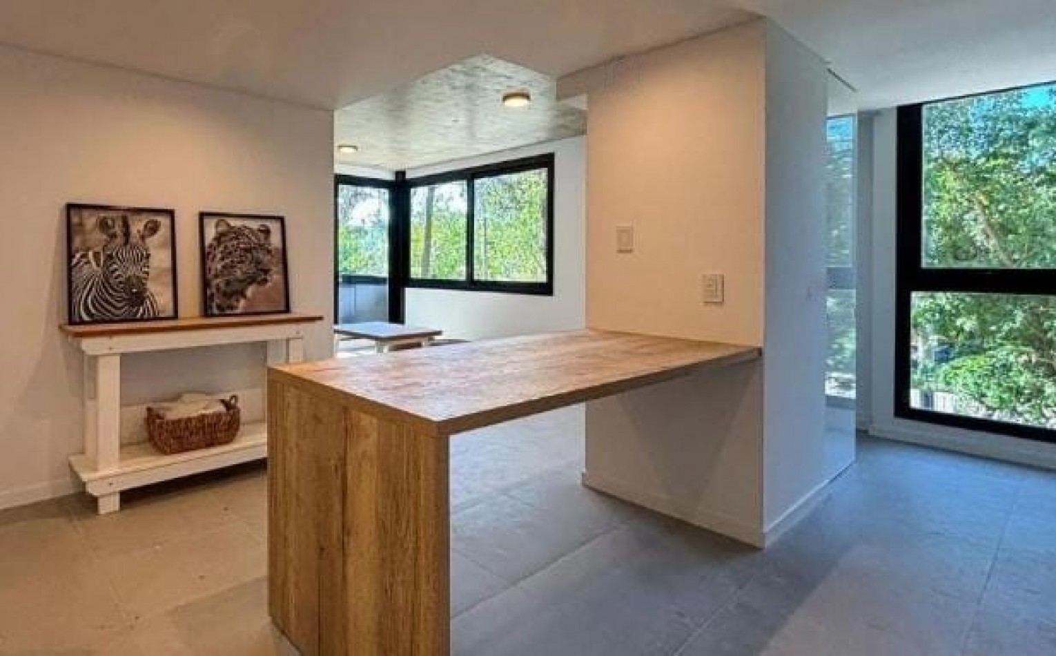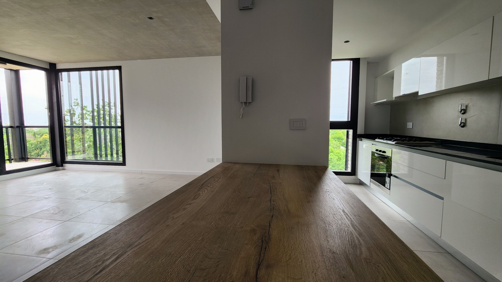 Se ingresa a un amplio ambiente conformado por el estar comedor con cocina integrada por barra separadora, baño completo y 2 dormitorios.