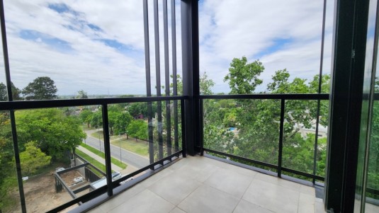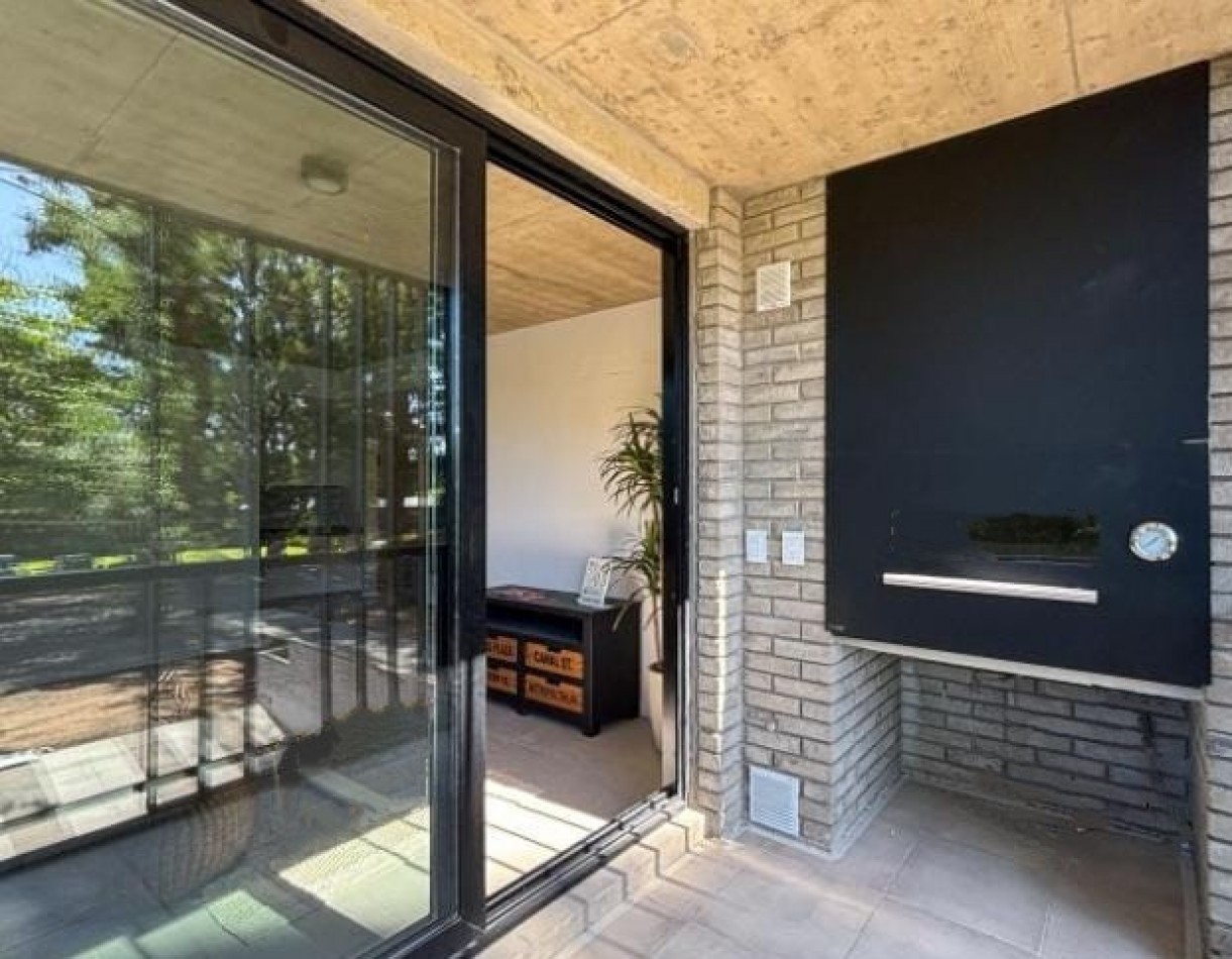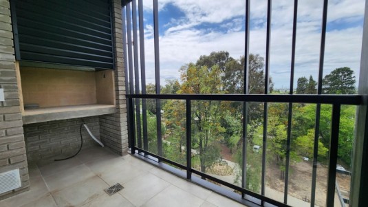 Balcón corrido con parrillero y salida desde el estar y desde uno de los dormitorios.