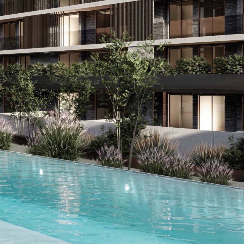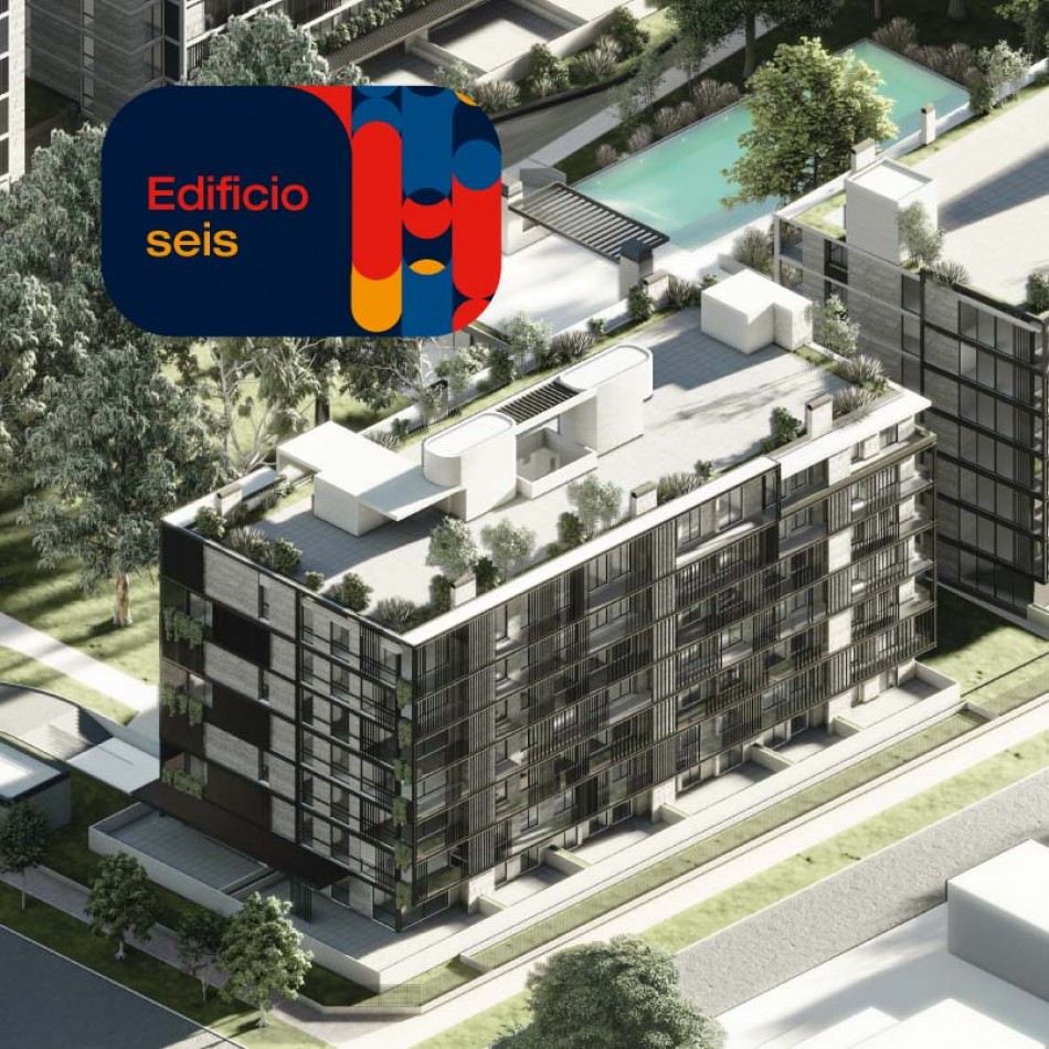 Compuesto por seis edificios de 6 plantas de departamentos de 1, 2 y 3 dormitorios con superficies de 54m², 76m² y 108m² respectivamente. Las unidades están equipadas con pisos de porcelanato en estar, comedor y baños, en dormitorios pisos de ingeniaría y sócalos de polietileno blanco. Terminaciones de cielo raso en dormitorios y losa vista de hormigón en los demás ambientes.