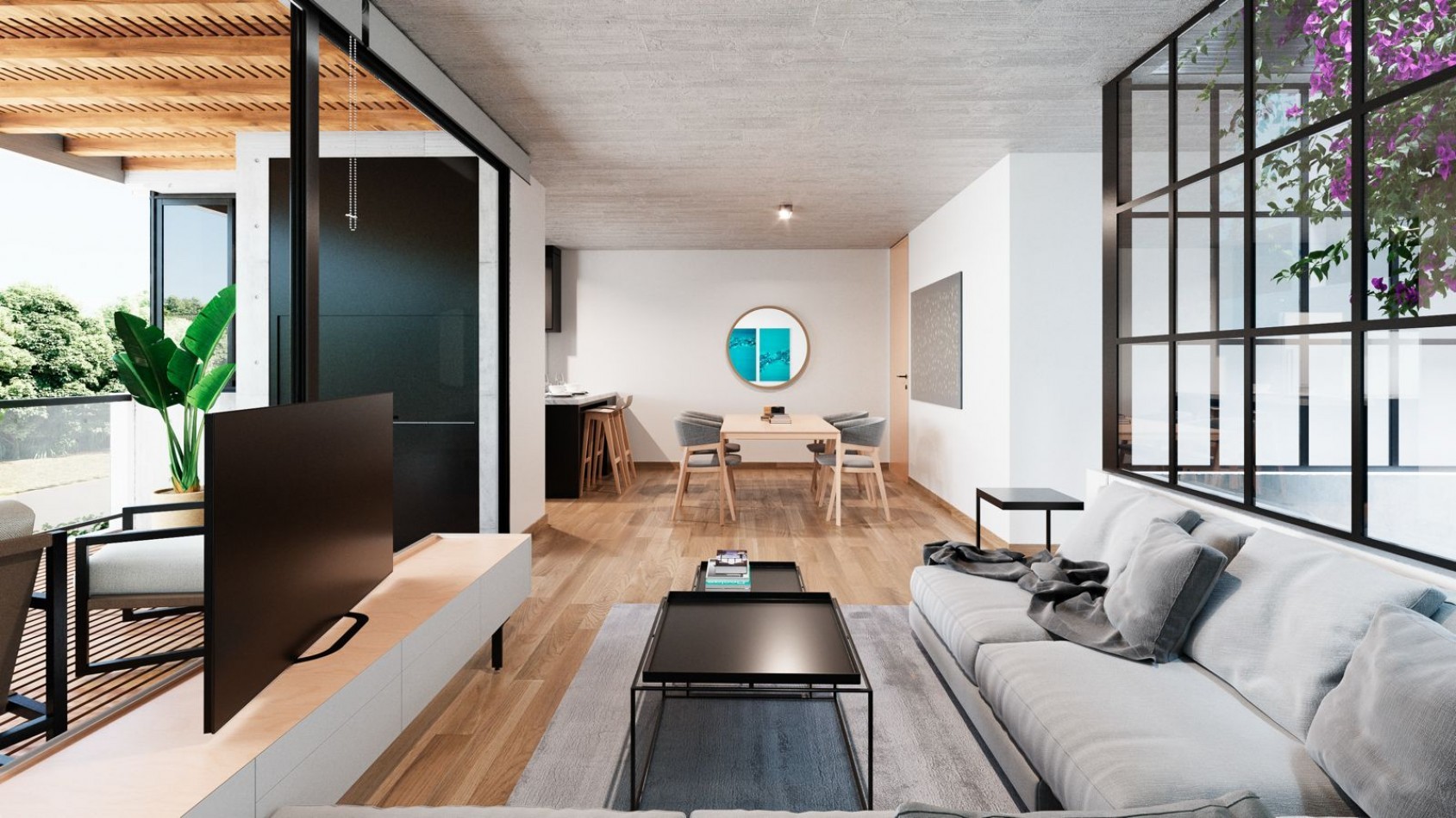 Pisos porcelanatos símil madera en espacios comunes, aberturas de aluminio negro con DVH.