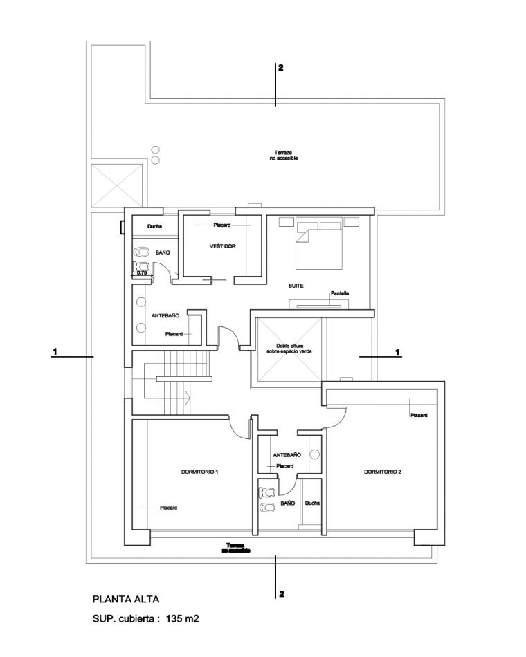La planta alta está destinada al área privada de la vivienda. Allí se desarrollan dos dormitorios con placares, asistidos por un baño completo con antebaño, y una suite principal que se destaca por sus dimensiones y confort, equipada con vestidor, amplio antebaño y baño con ducha.