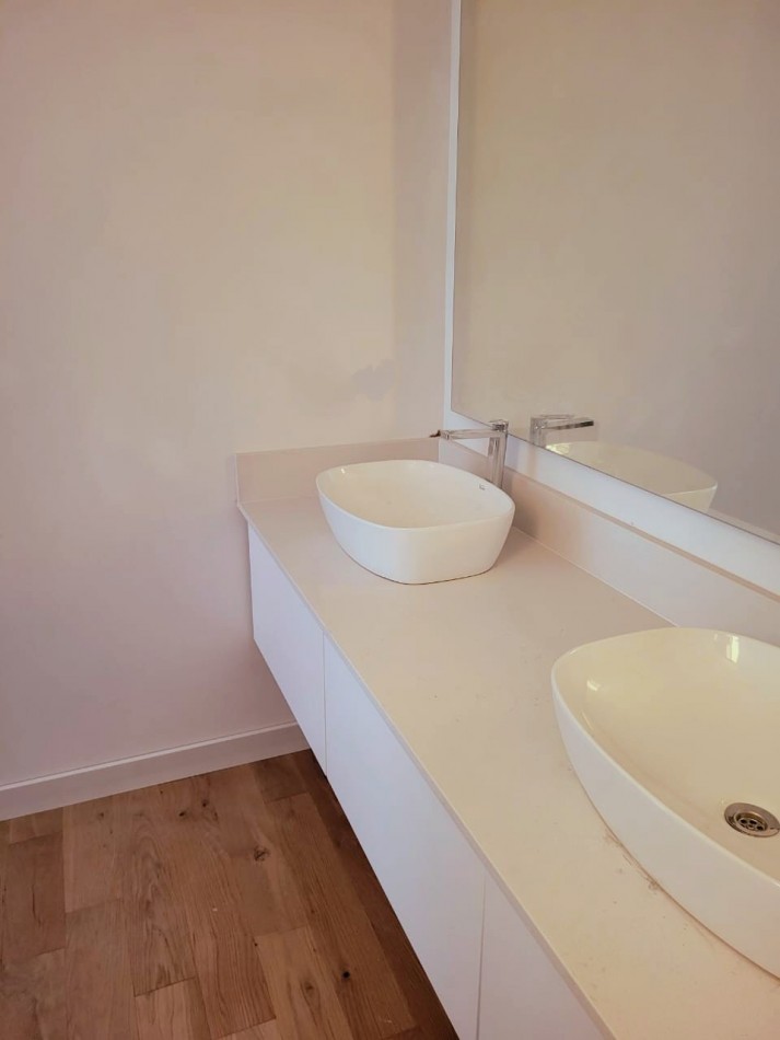 muebles de melamina color blanco en interior y frentes. Mesada de Purastone