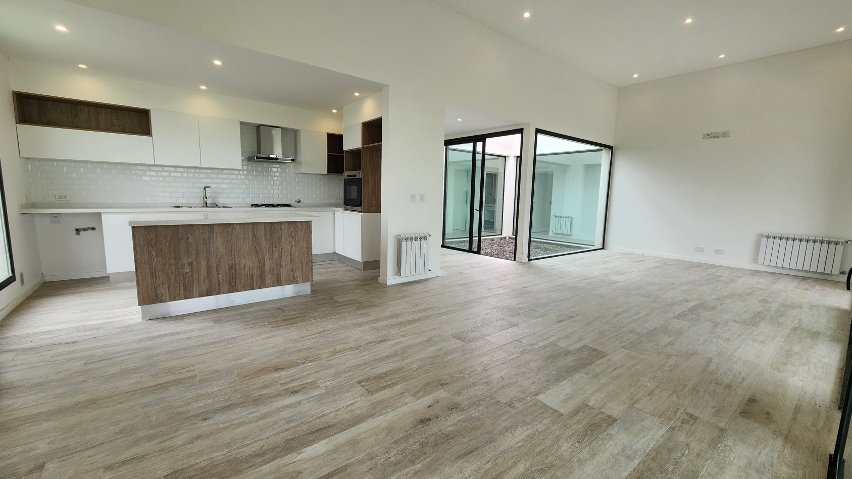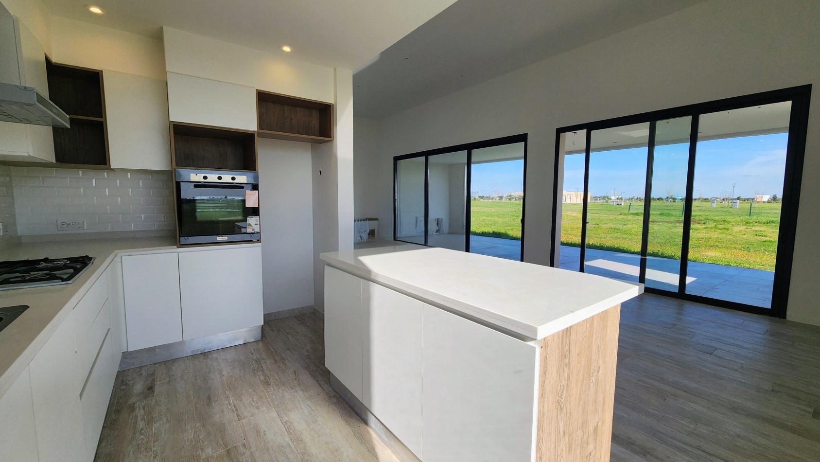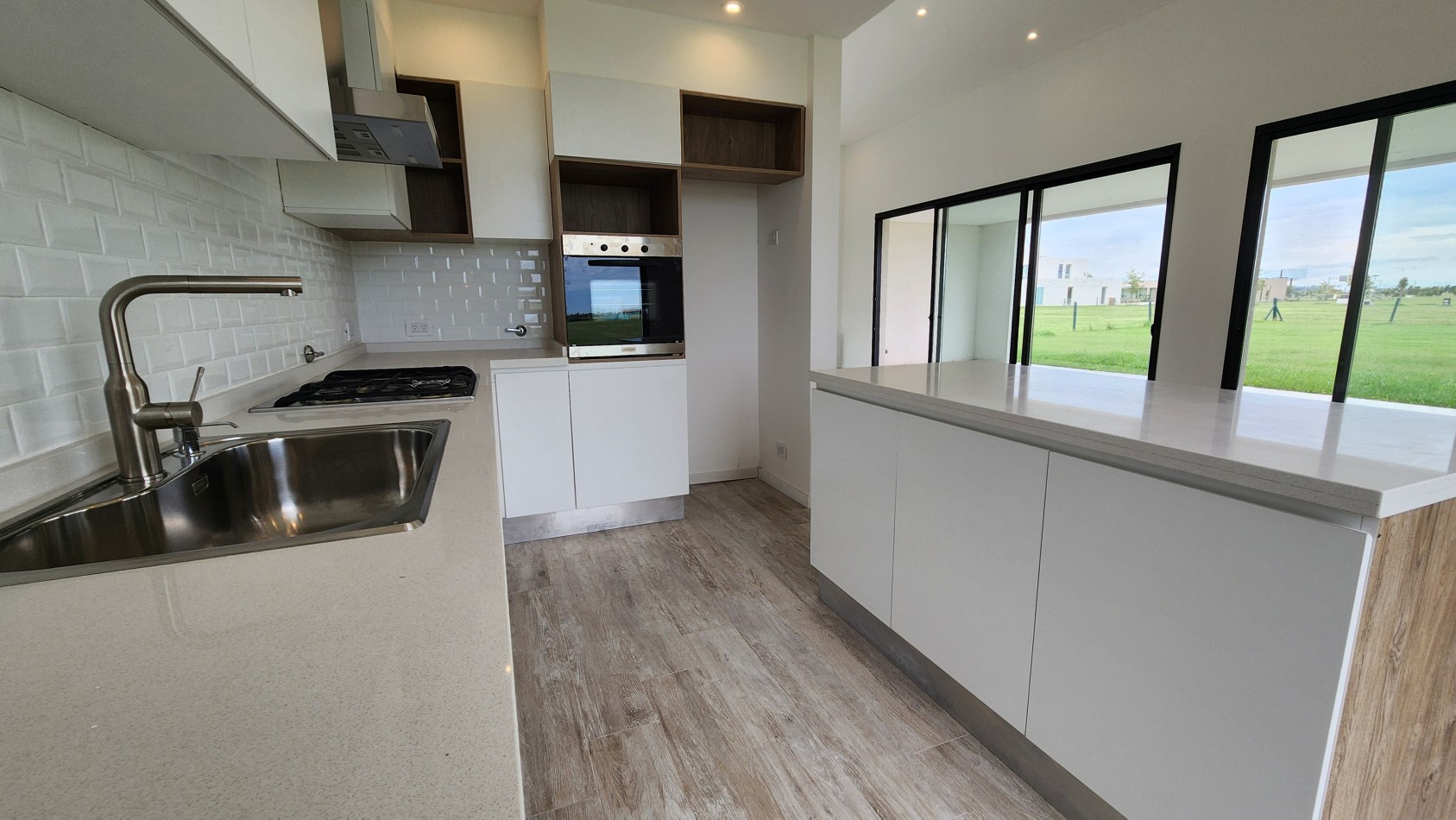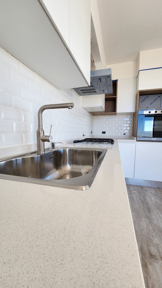 El área de living-comedor y cocina es amplia y luminosa, con un amplio ventanal que da vista hacia la galería semicubierta con gran parrillero. La cocina cuenta con una barra desayunadora.