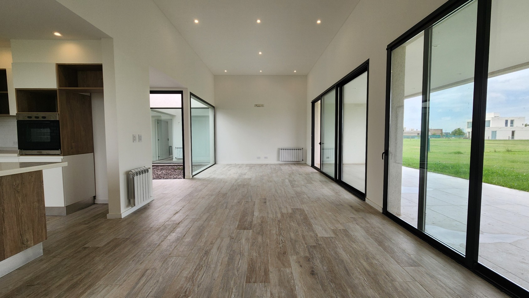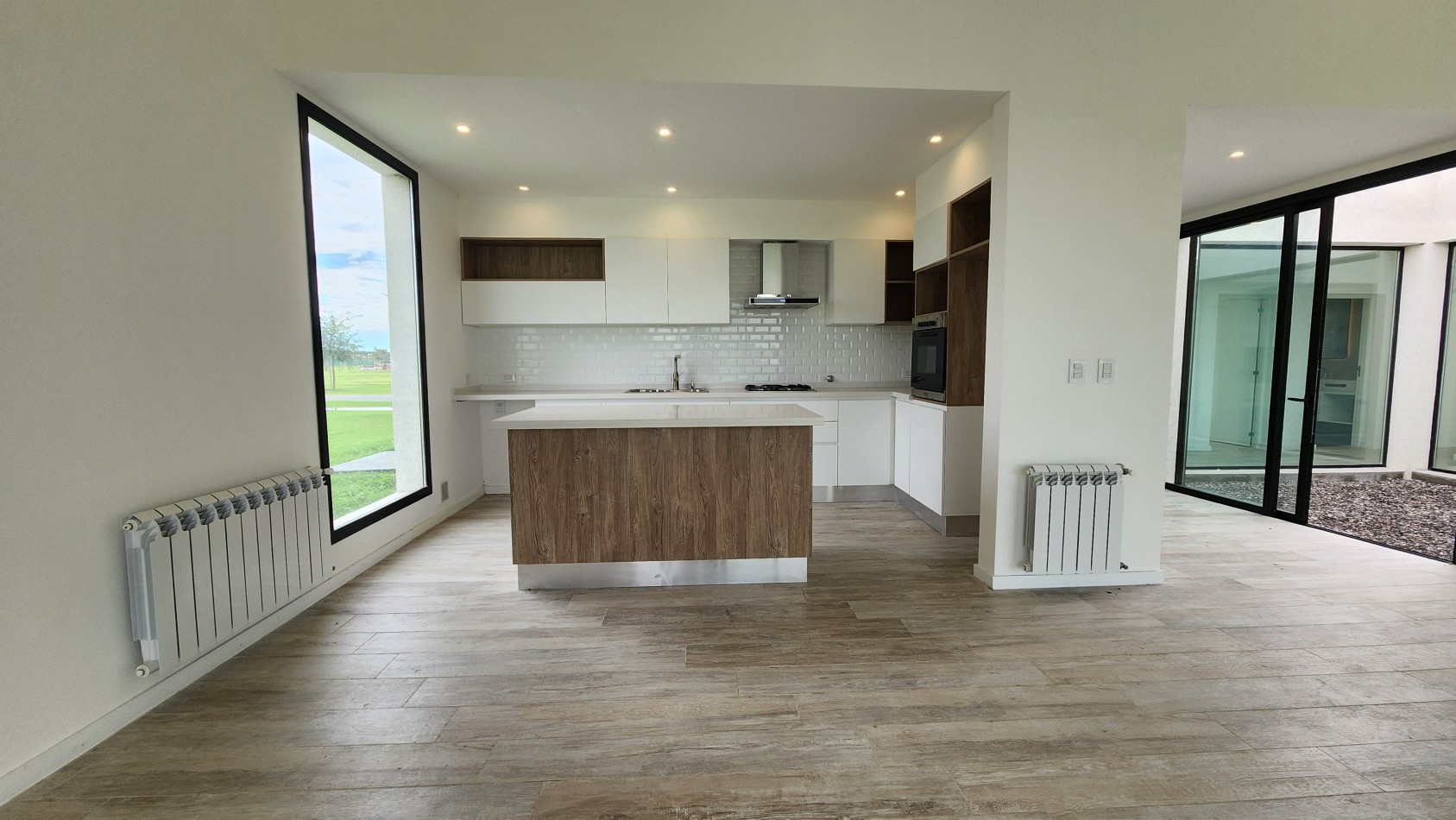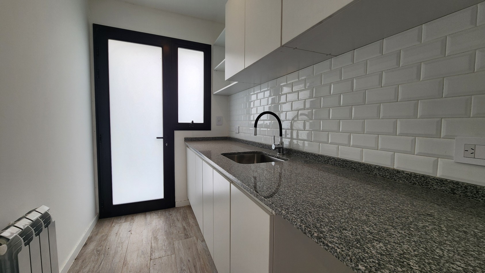El área de living-comedor y cocina es amplia y luminosa, con un amplio ventanal que da vista hacia la galería semicubierta con gran parrillero. La cocina cuenta con una barra desayunadora.
